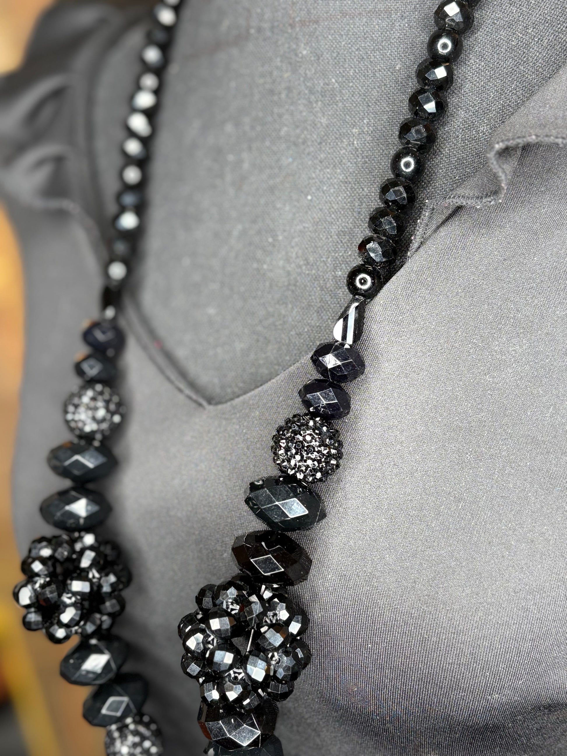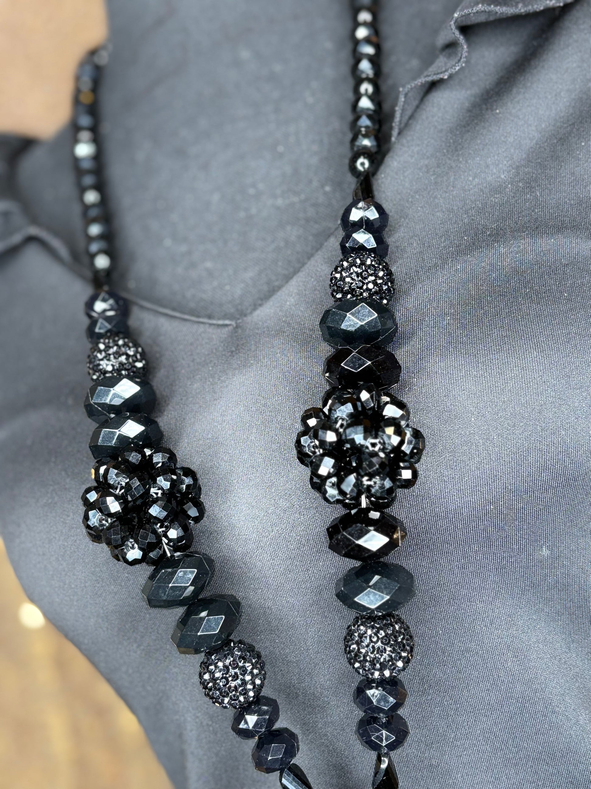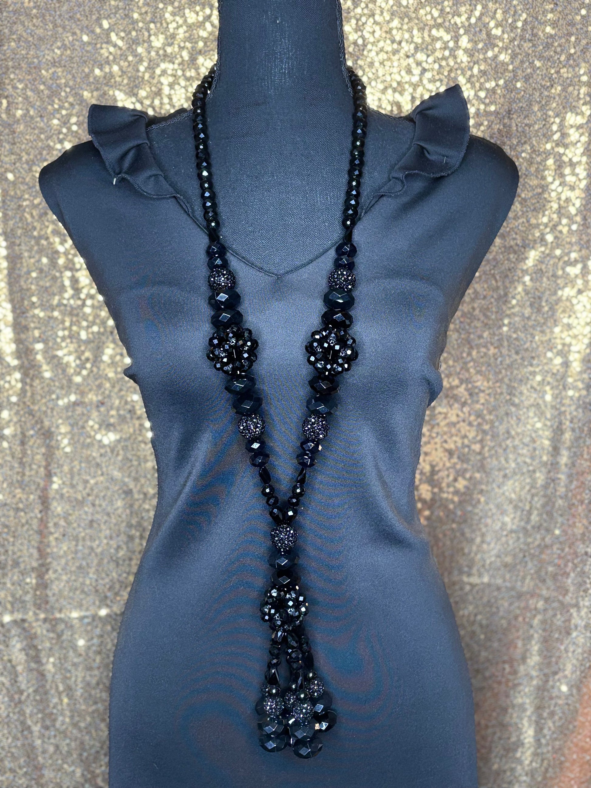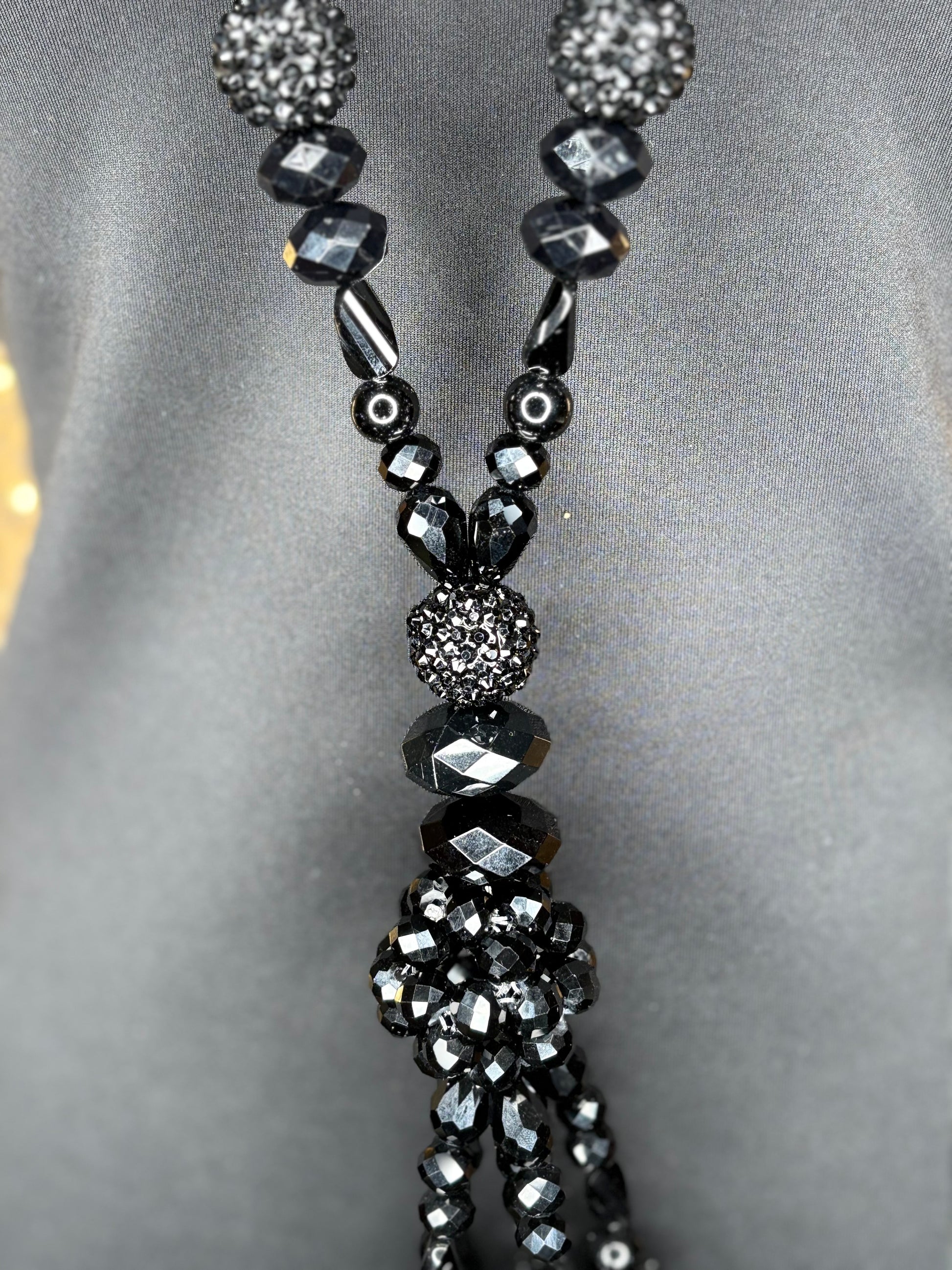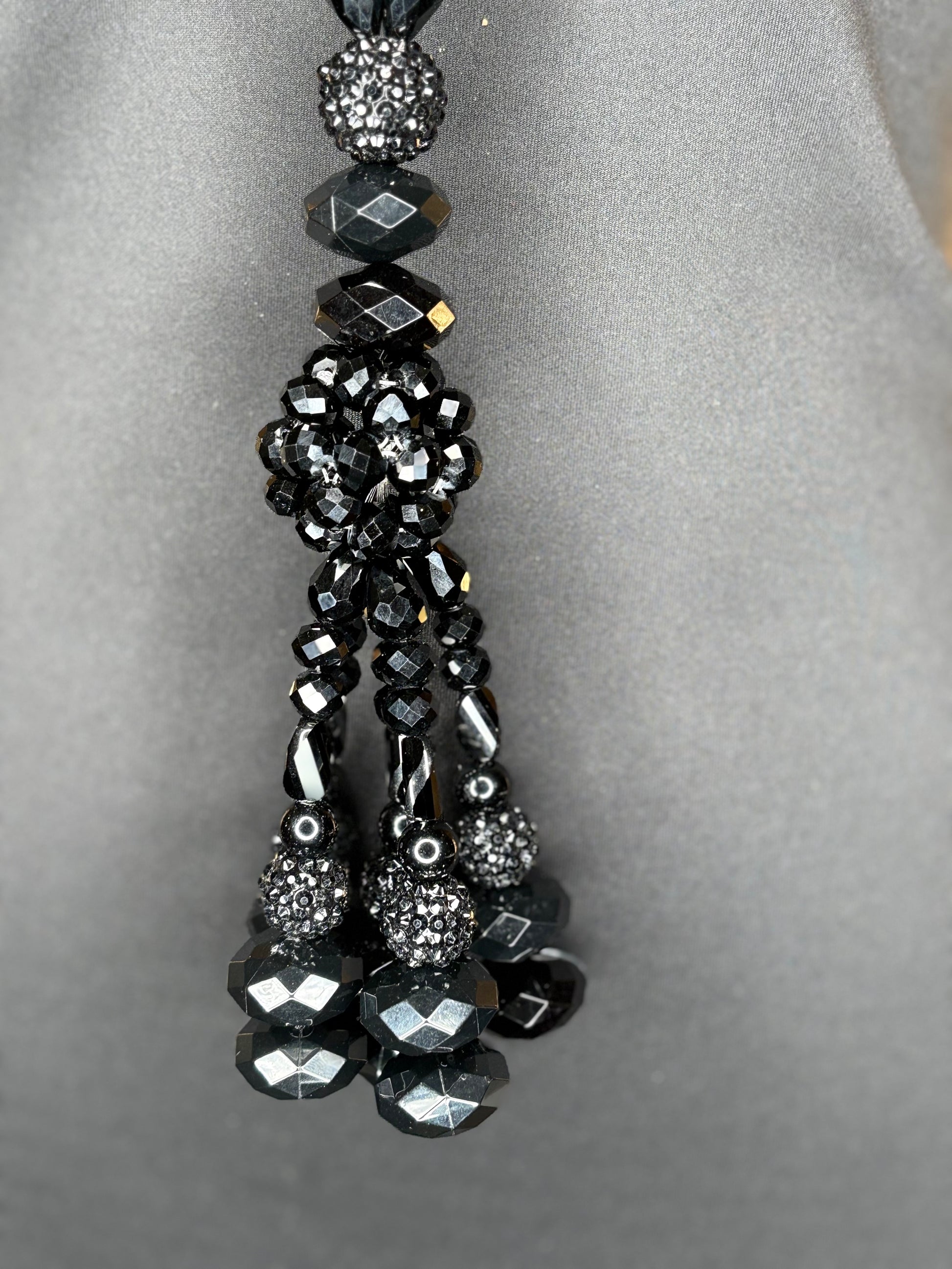 This handmade tassel necklace was carefully crafted with beautiful crystal (or rhinestone) beads. The model is wearing a 25-inch necklace design, but it can be altered to be longer or shorter.