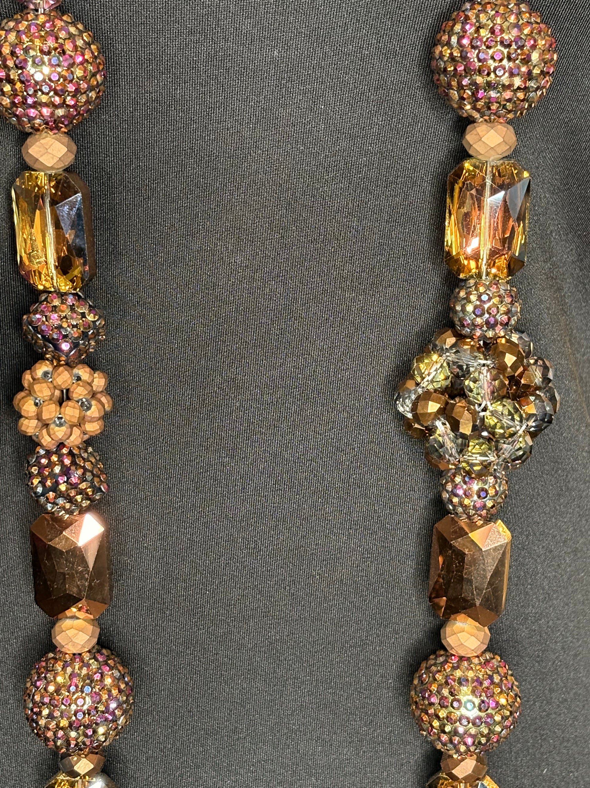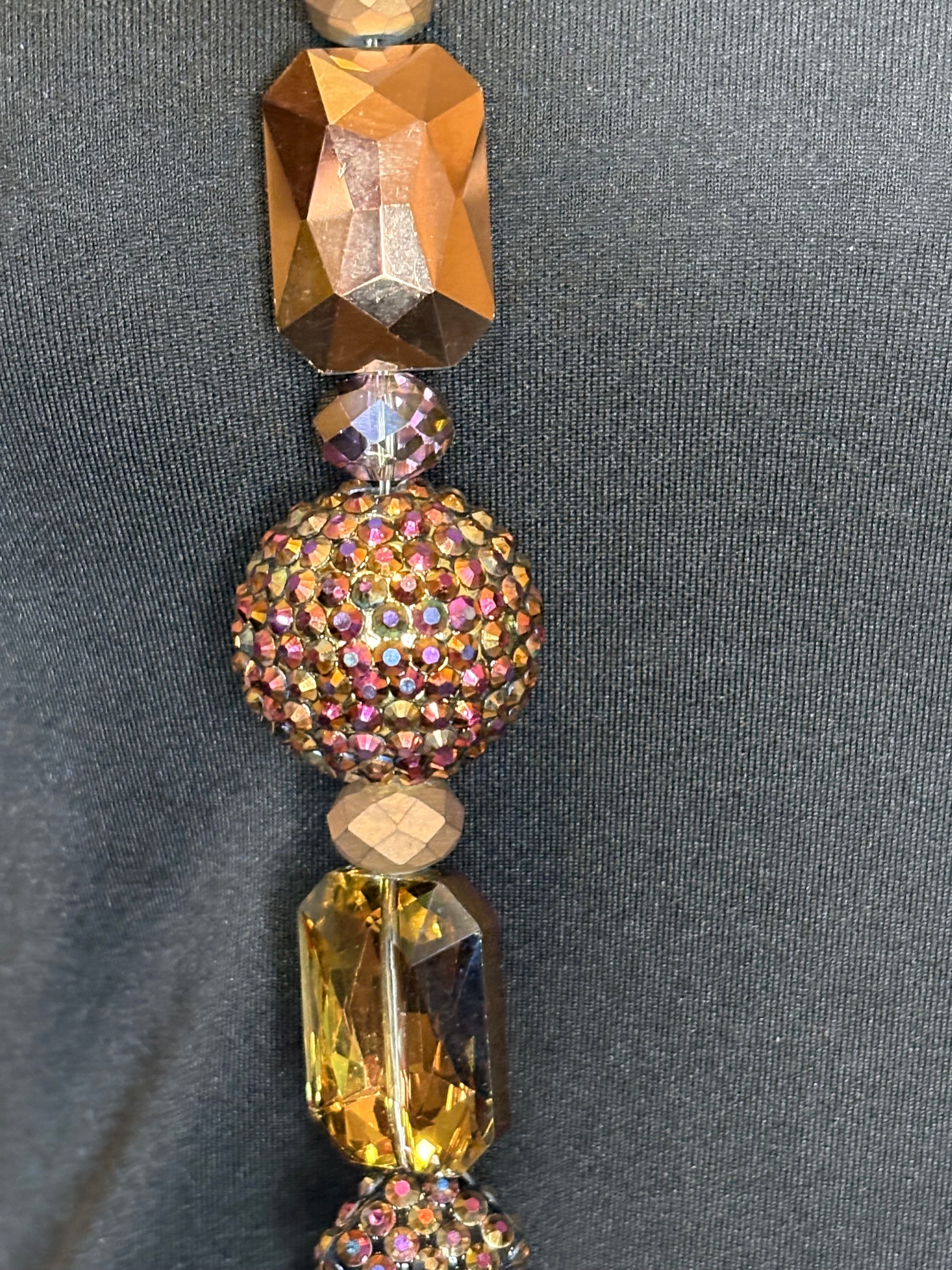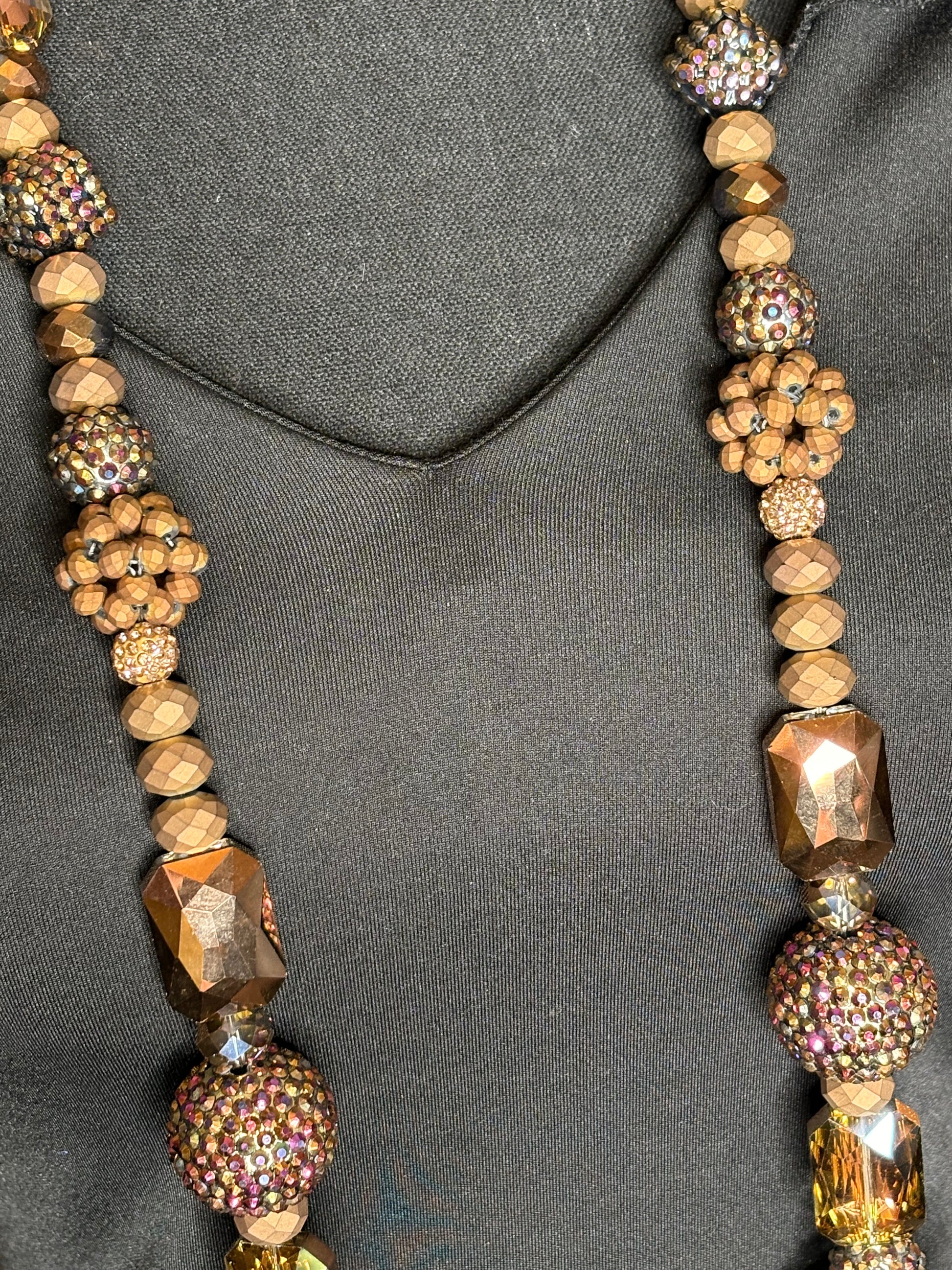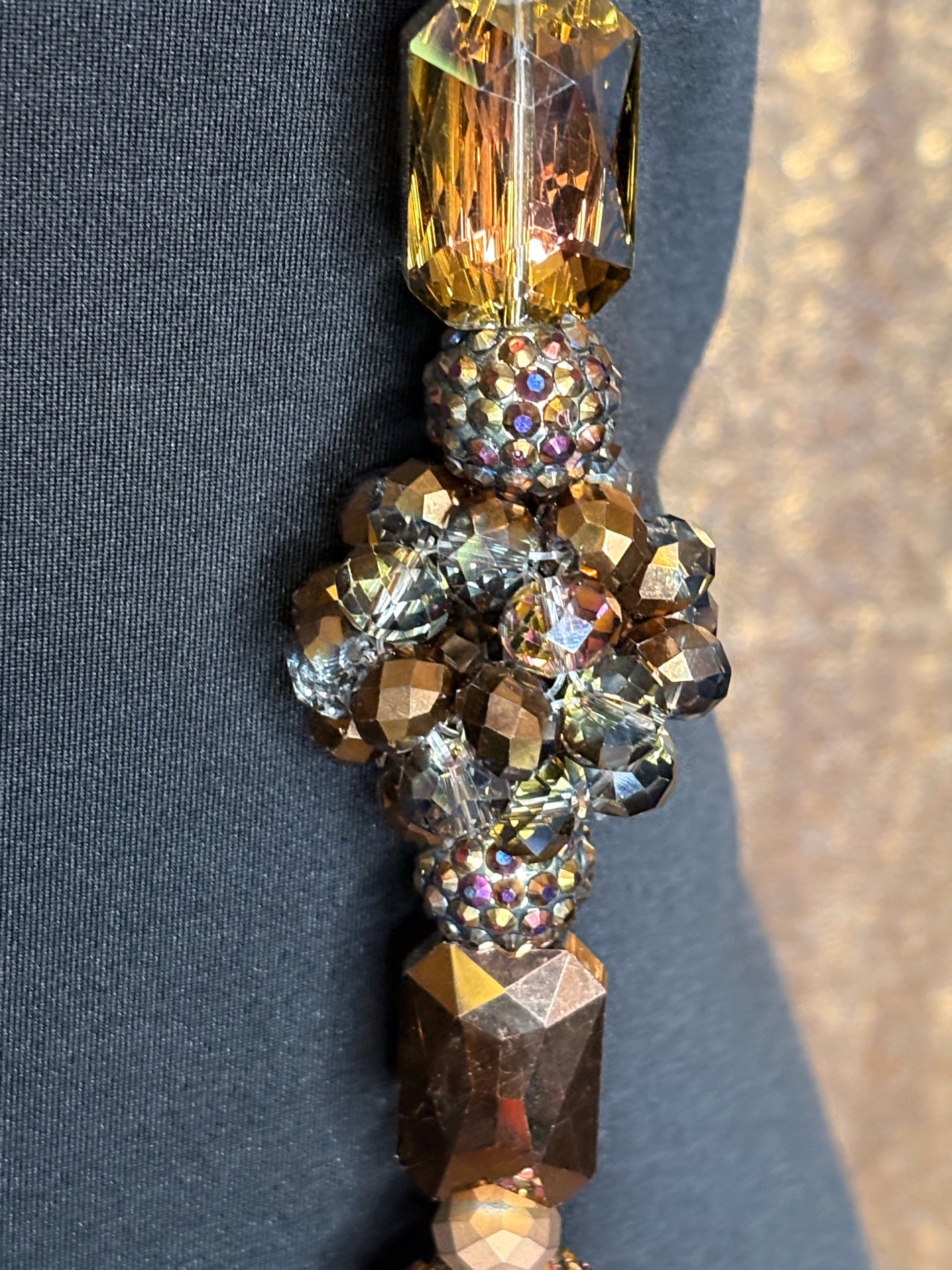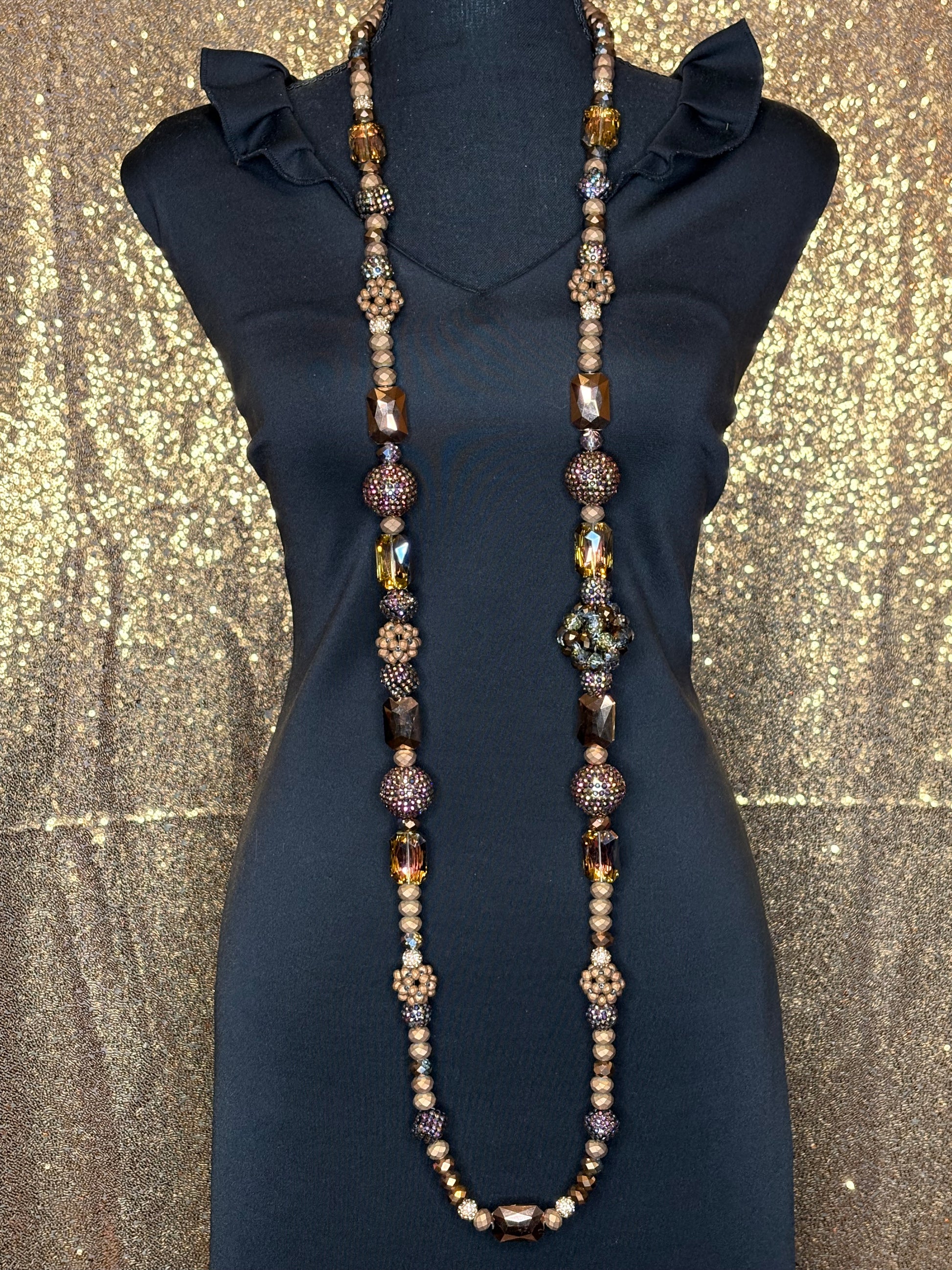 This handmade classic round necklace was carefully crafted with beautiful crystal (or rhinestone) beads. The model is wearing a 30-inch necklace design, but it can be altered to be longer or shorter.