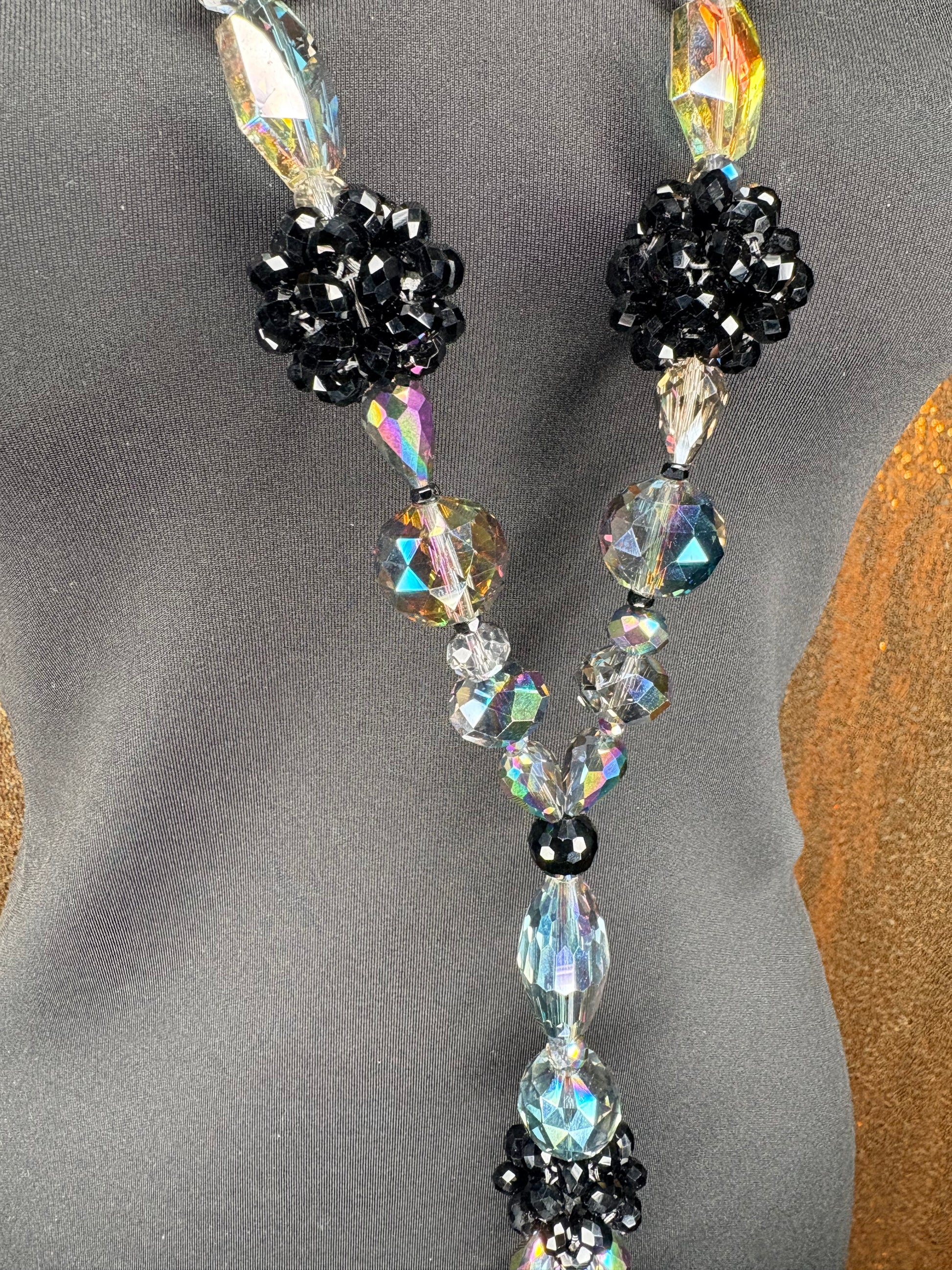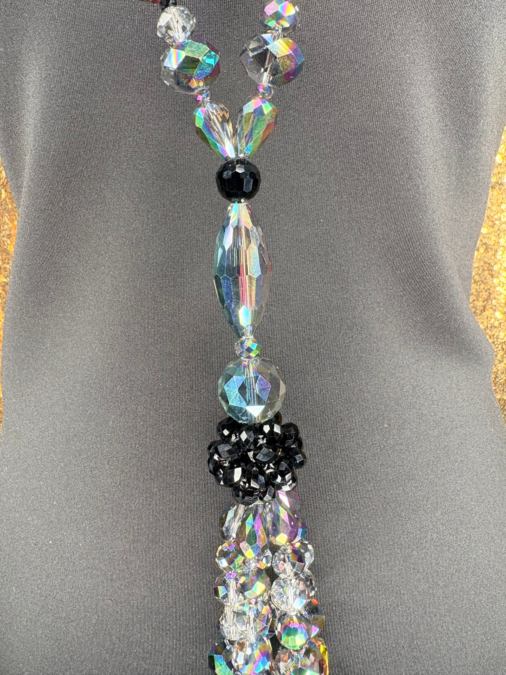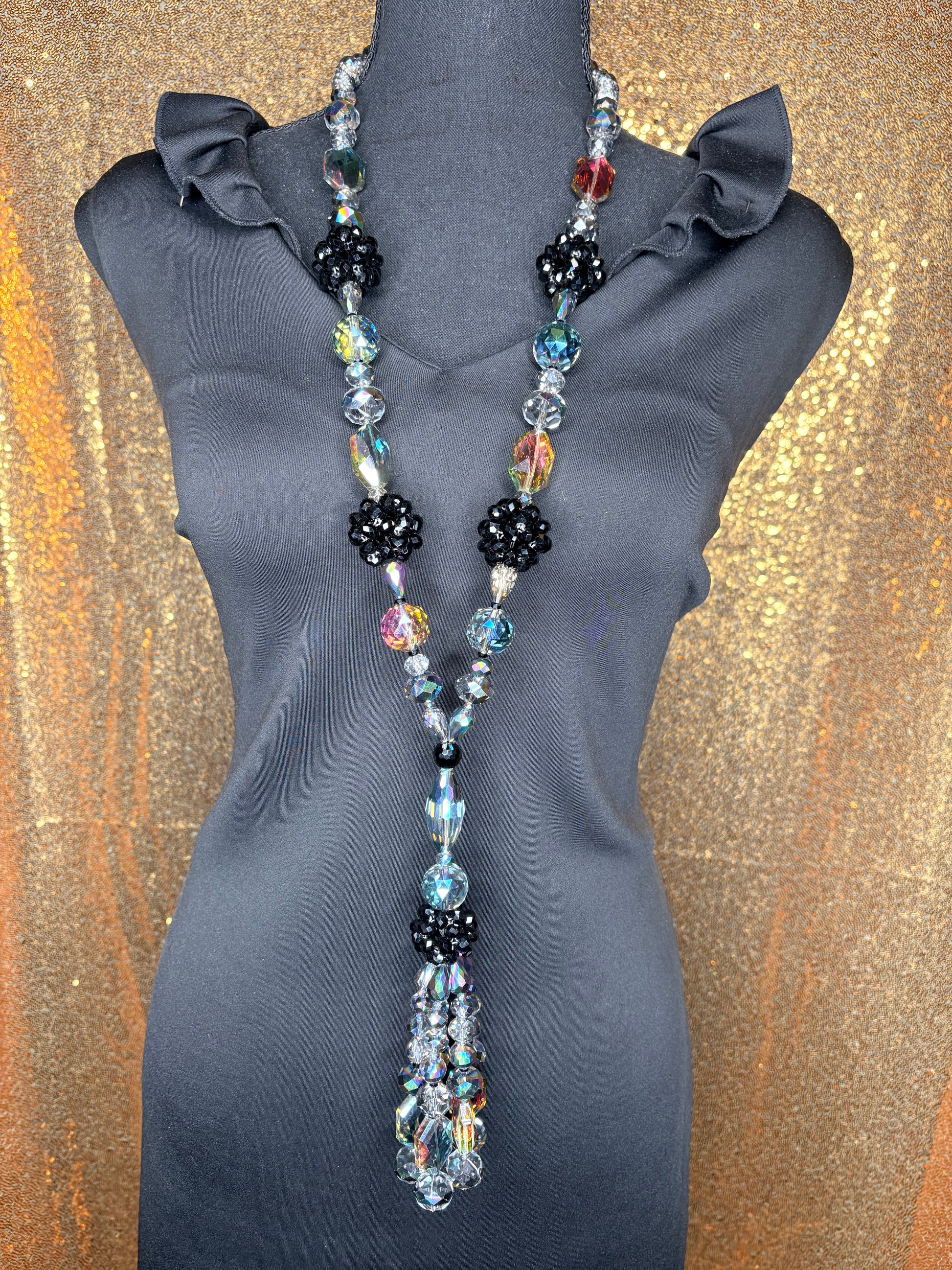This handmade tassel necklace was carefully crafted with beautiful crystal (or rhinestone) beads. The model is wearing a 25-inch necklace design, but it can be altered to be longer or shorter.