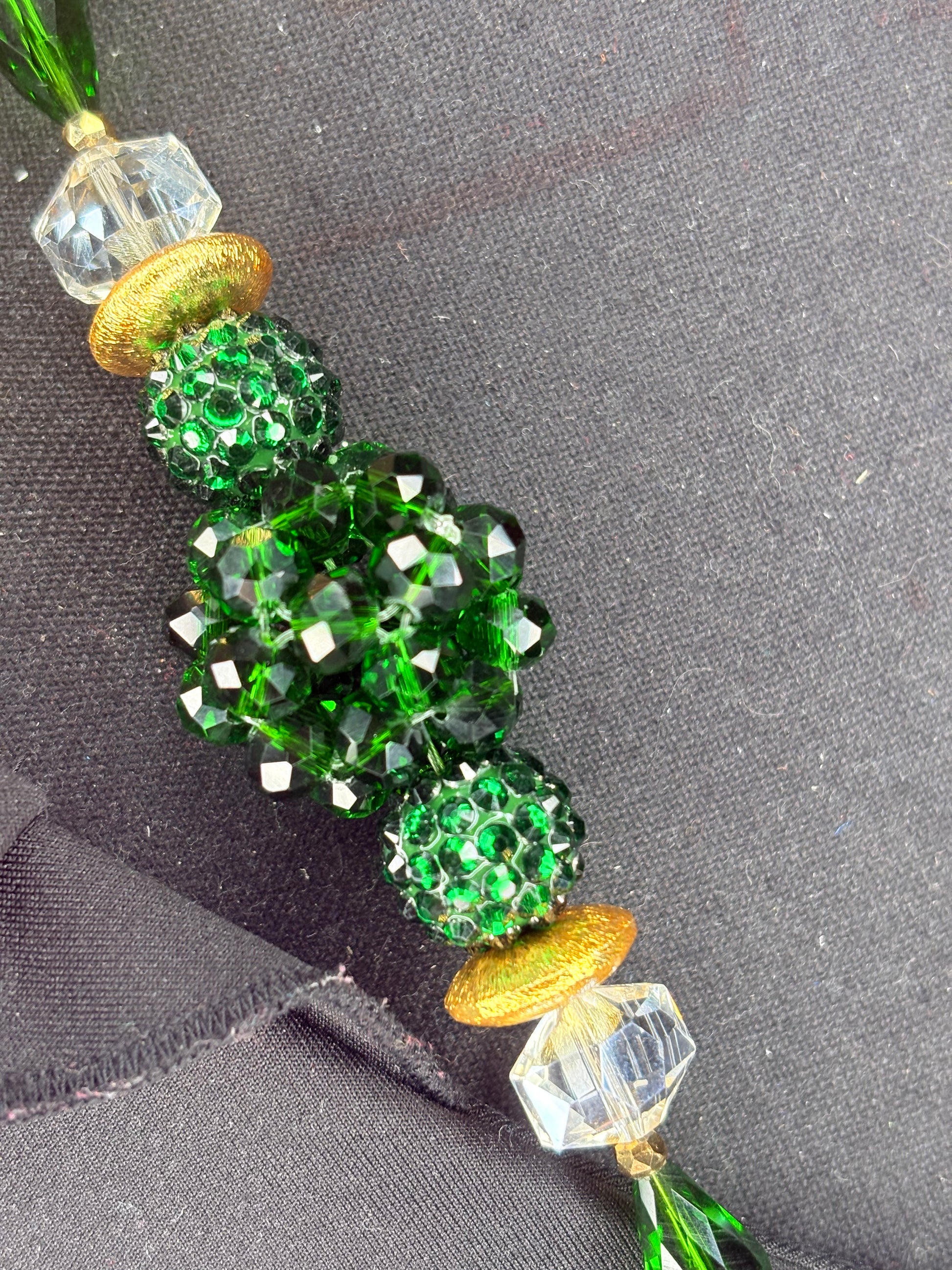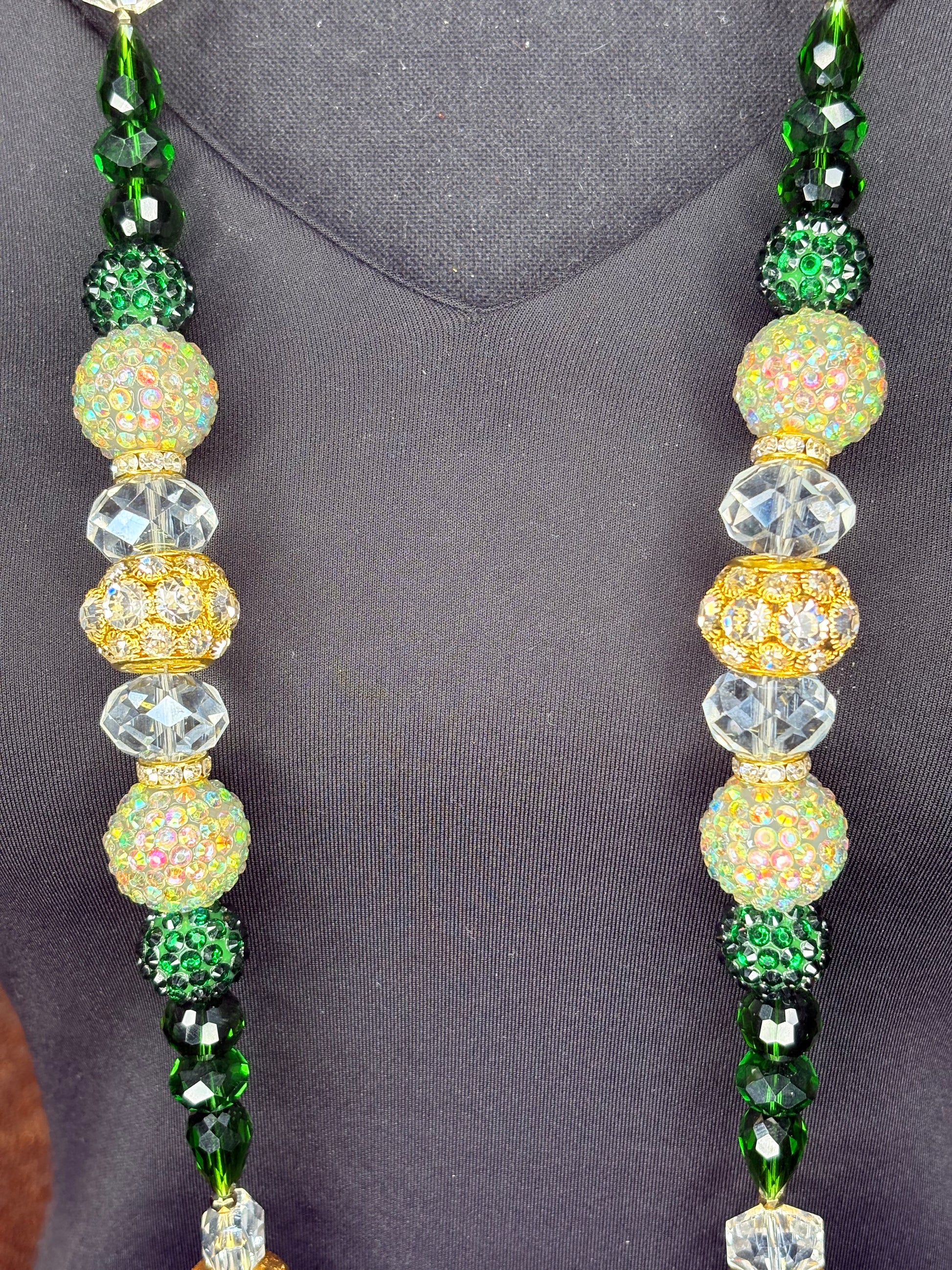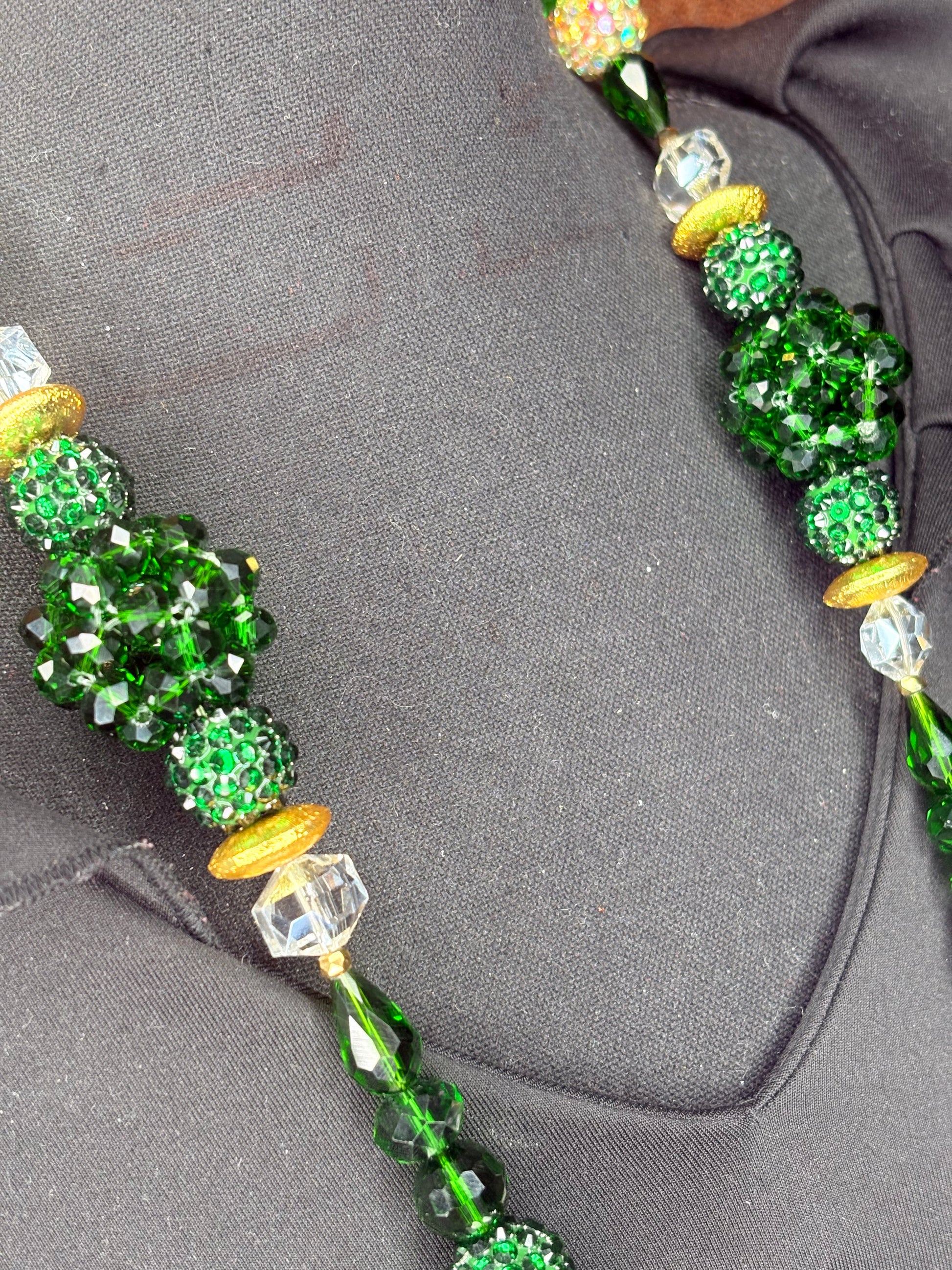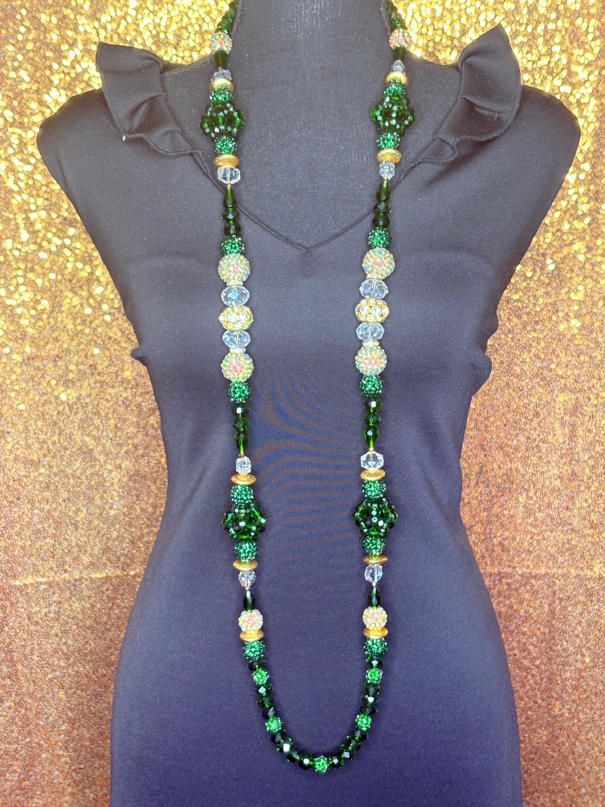 This handmade classic round necklace was carefully crafted with beautiful crystal (or rhinestone) beads. The model is wearing a 25-inch necklace design, but it can be altered to be longer or shorter.