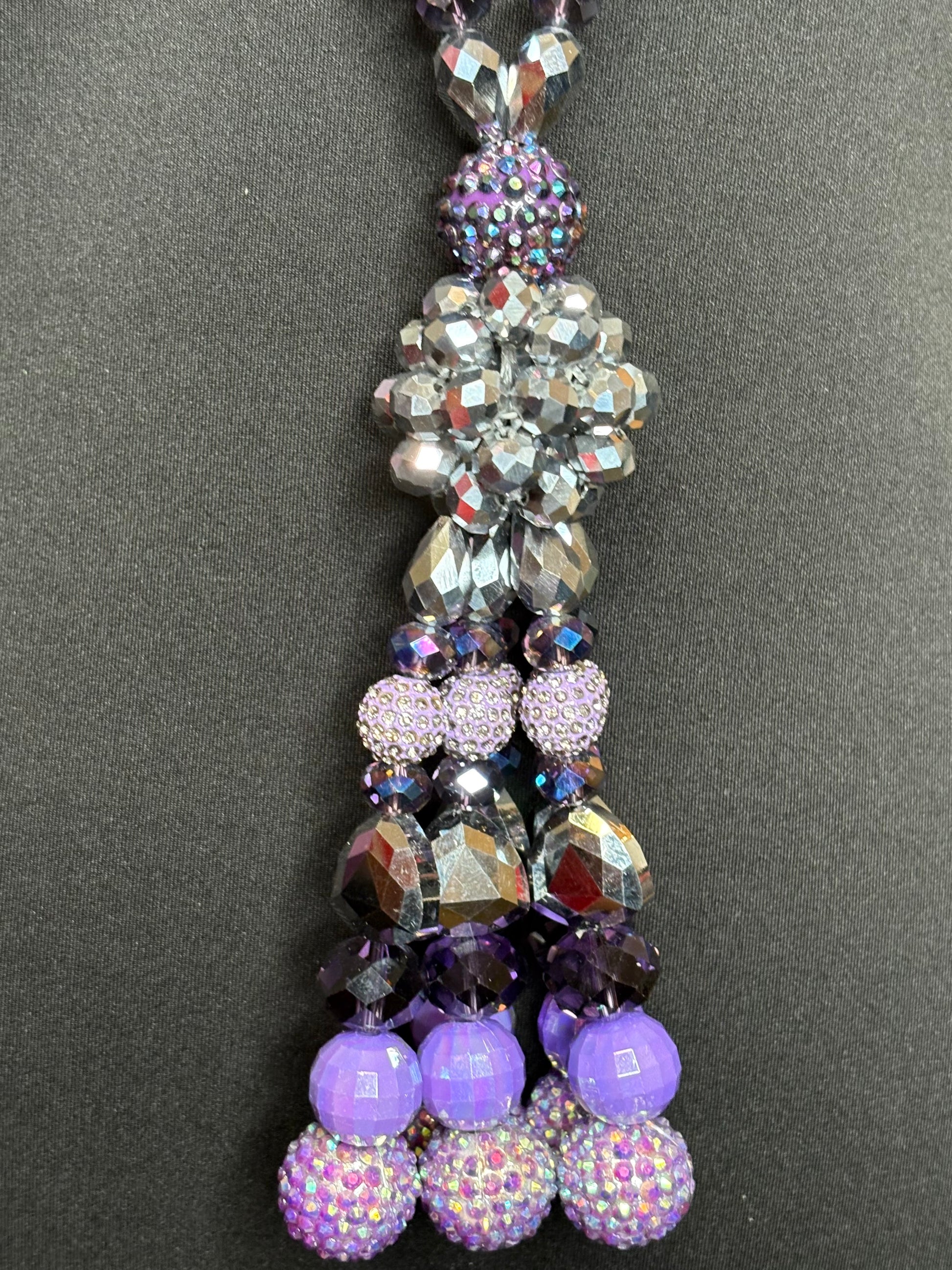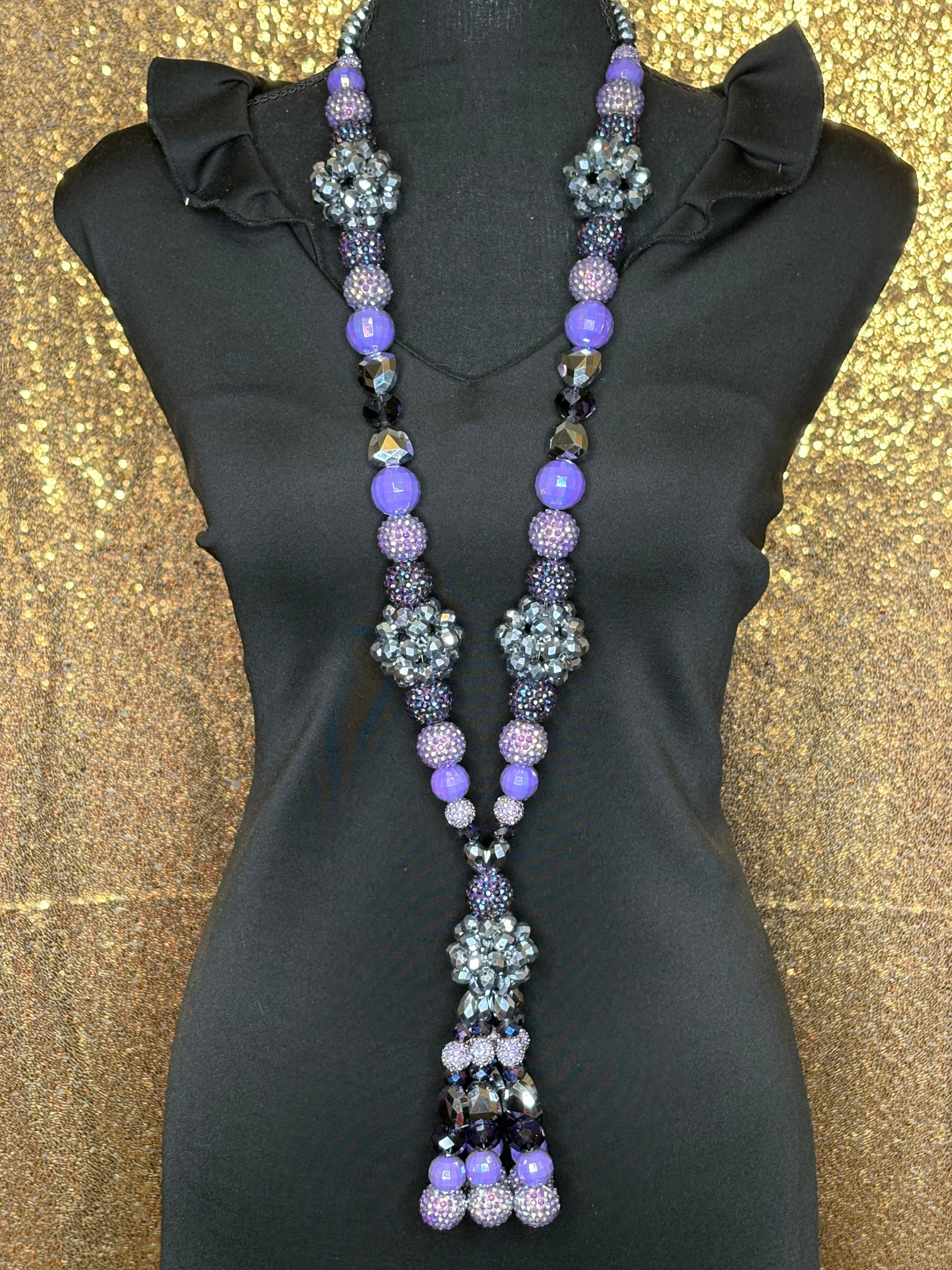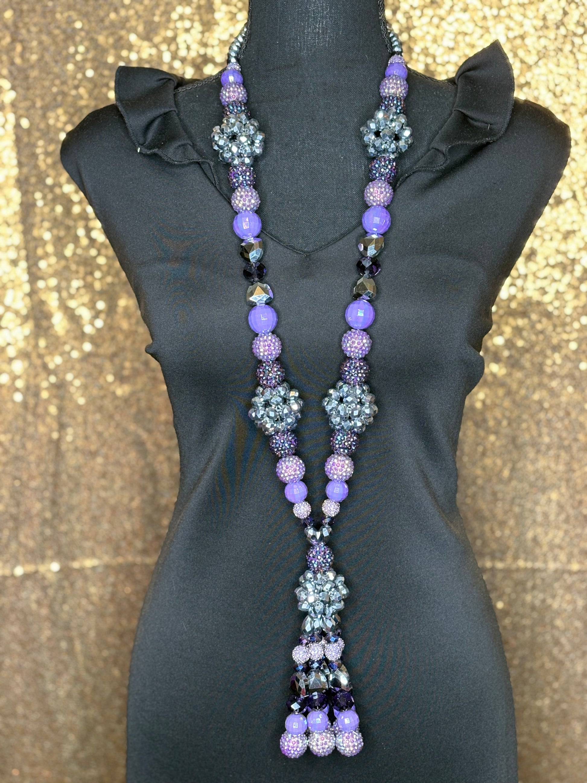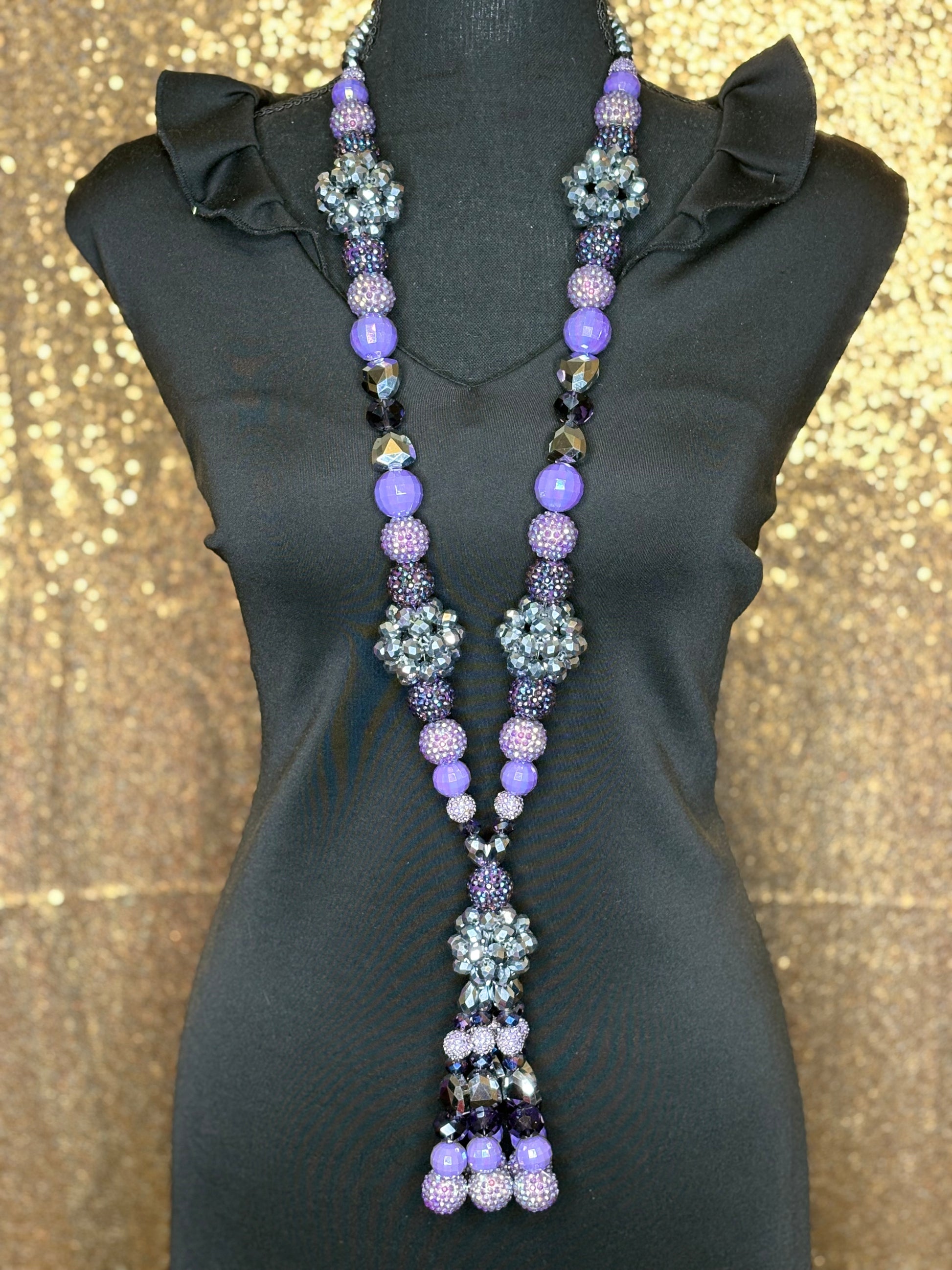 This handmade tassel necklace was carefully crafted with beautiful crystal (or rhinestone) beads. The model is wearing a 25-inch necklace design, but it can be altered to be longer or shorter.