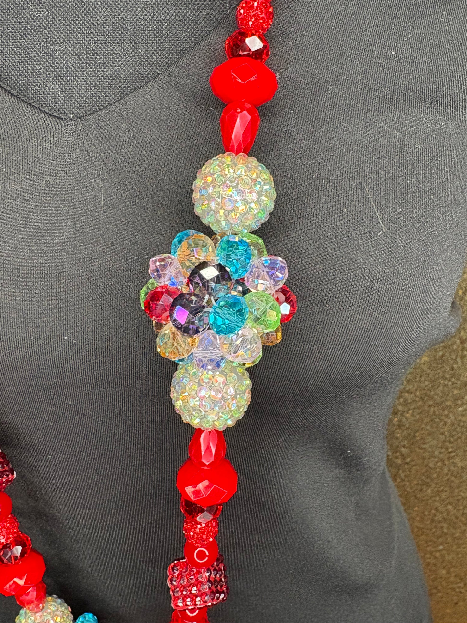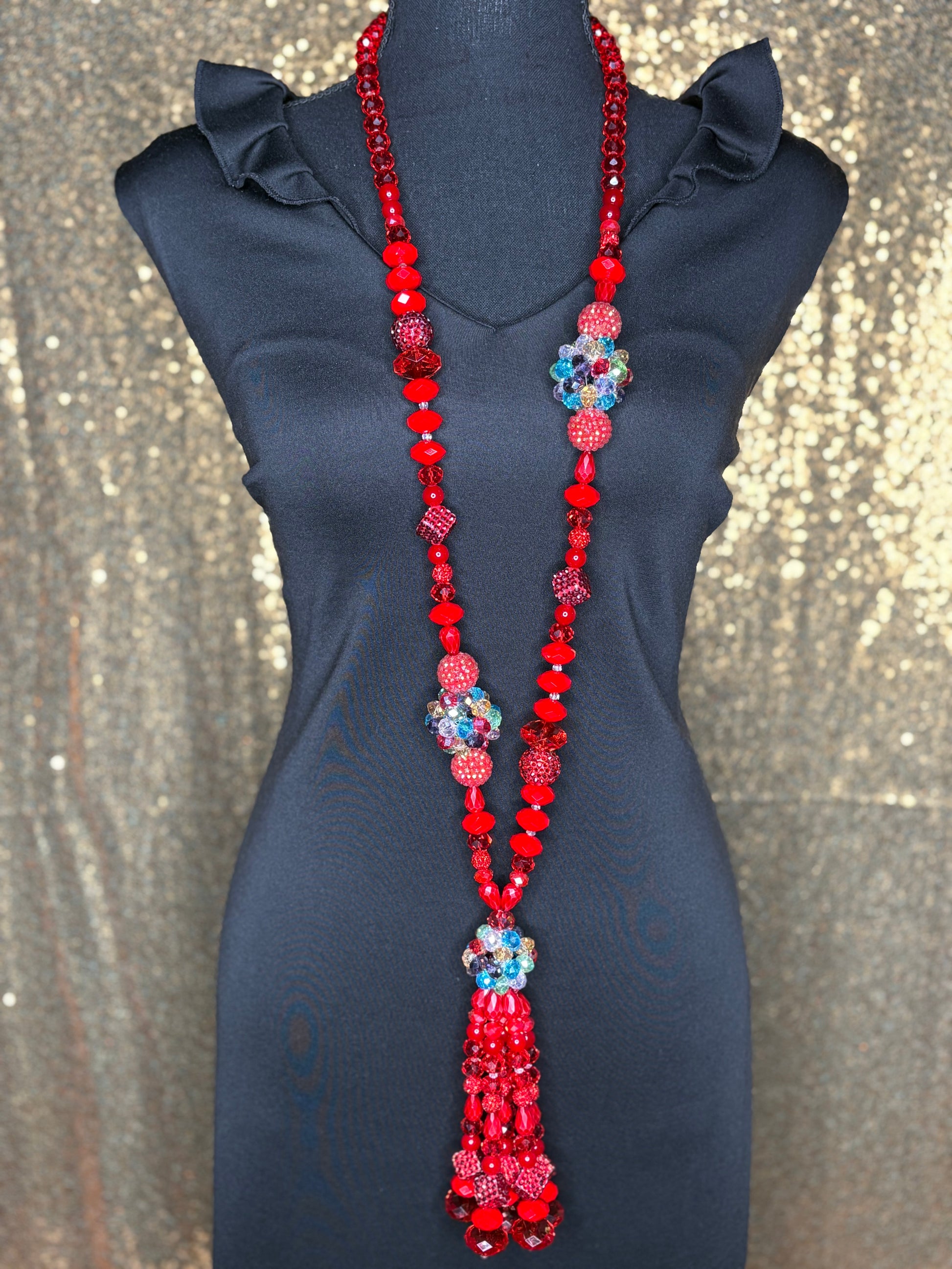 This handmade tassel necklace was carefully crafted with beautiful crystal (or rhinestone) beads. The model is wearing a 30-inch necklace design, but it can be altered to be longer or shorter.