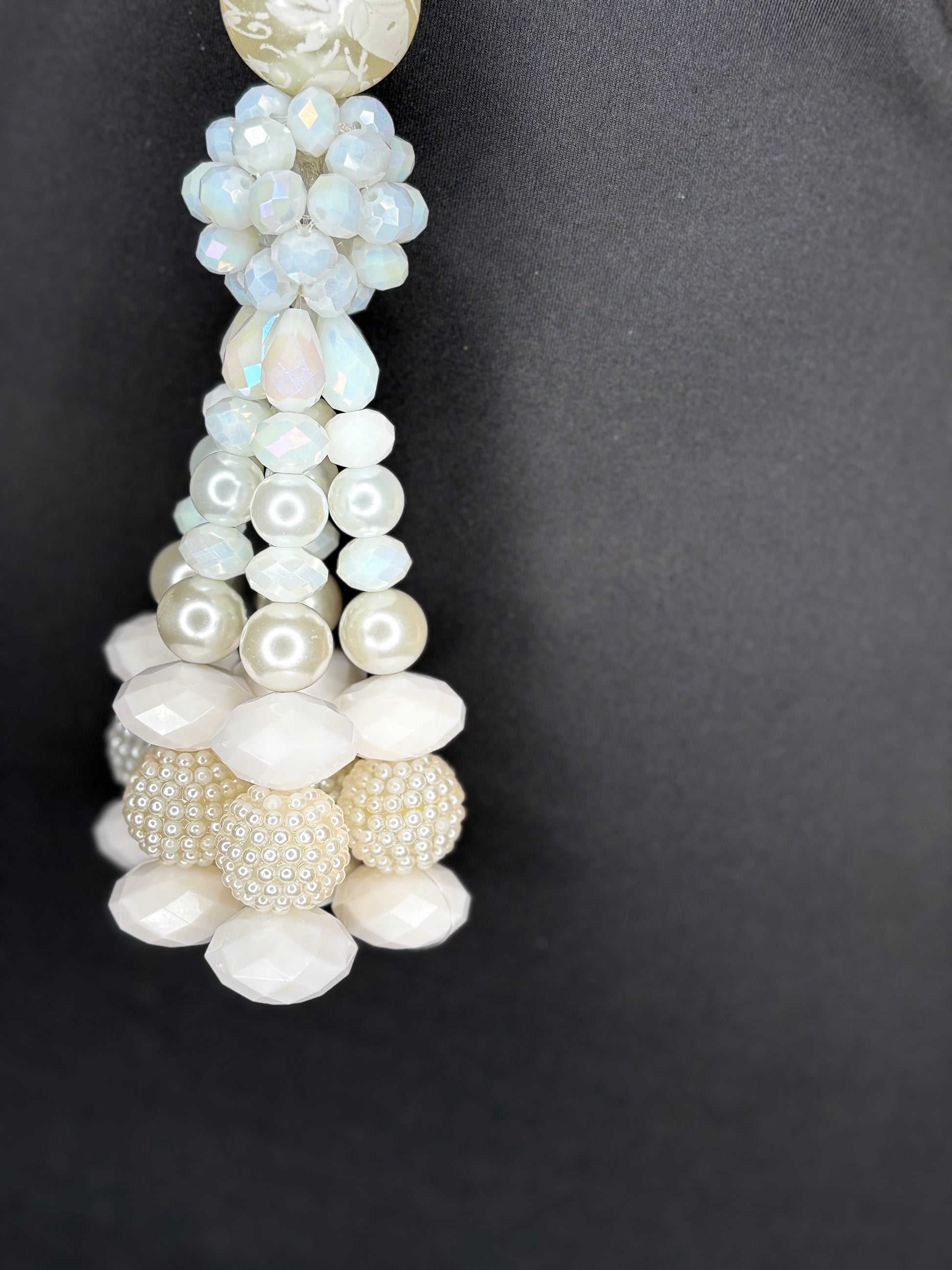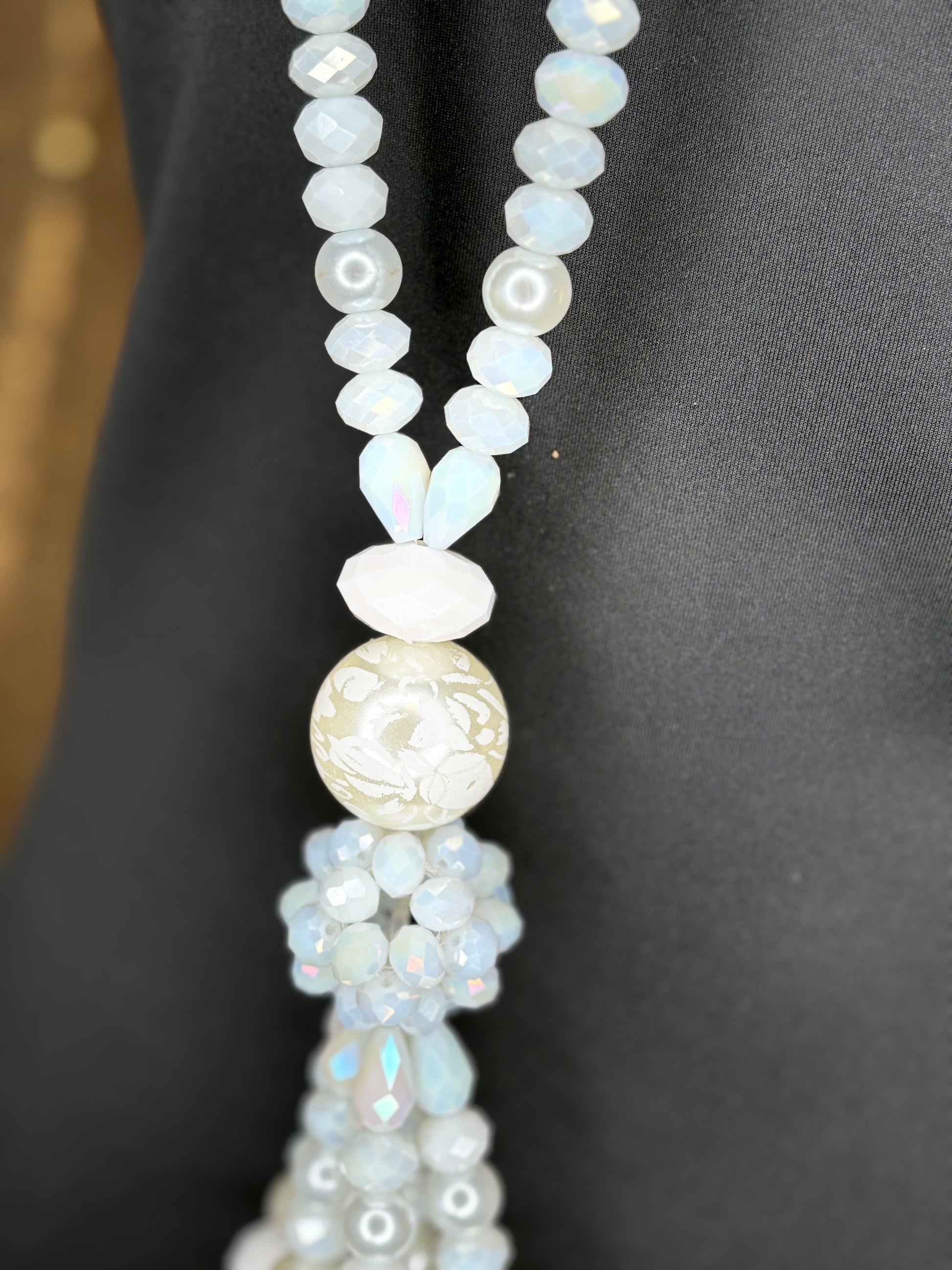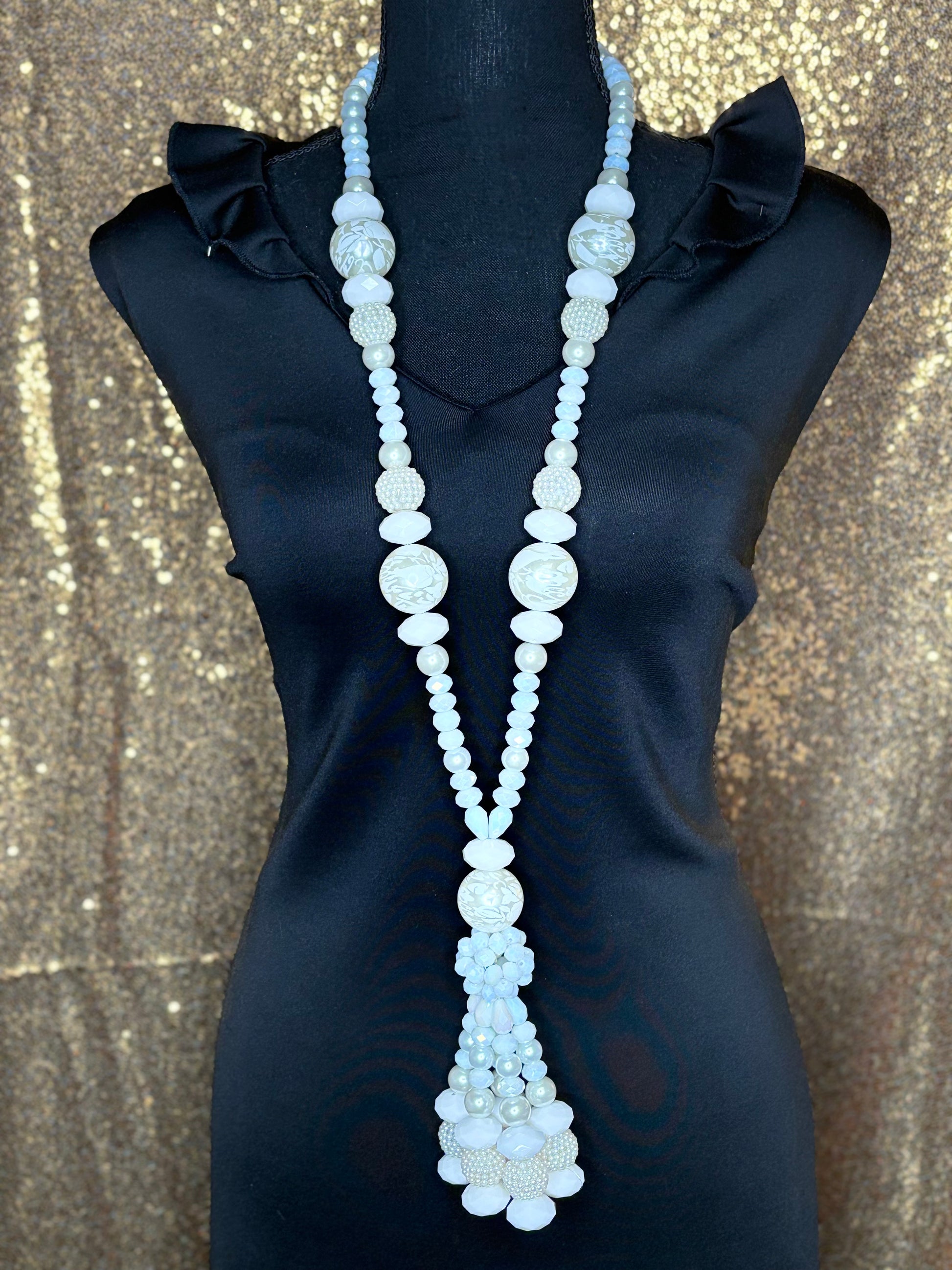 This handmade tassel necklace was carefully crafted with beautiful crystal (or rhinestone) beads. The model is wearing a 25 & 30-inch necklace design, but it can be altered to be longer or shorter.