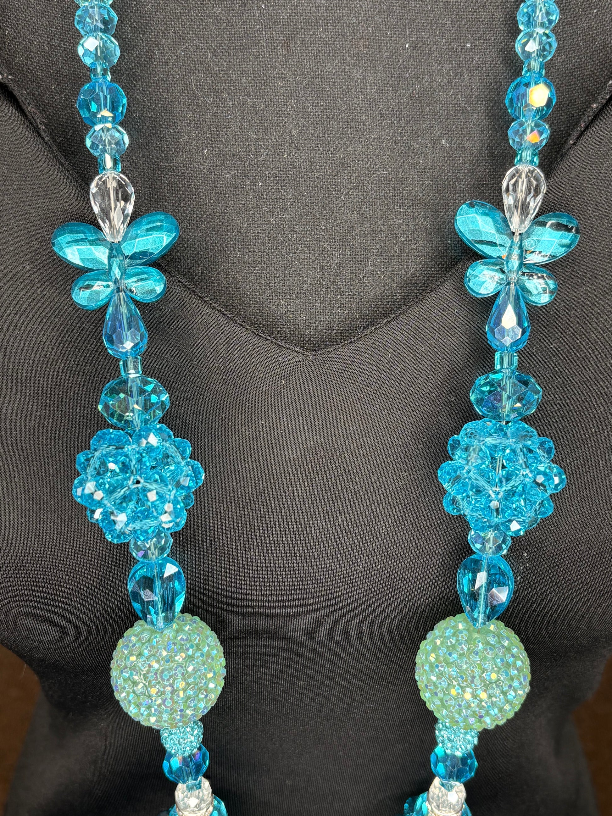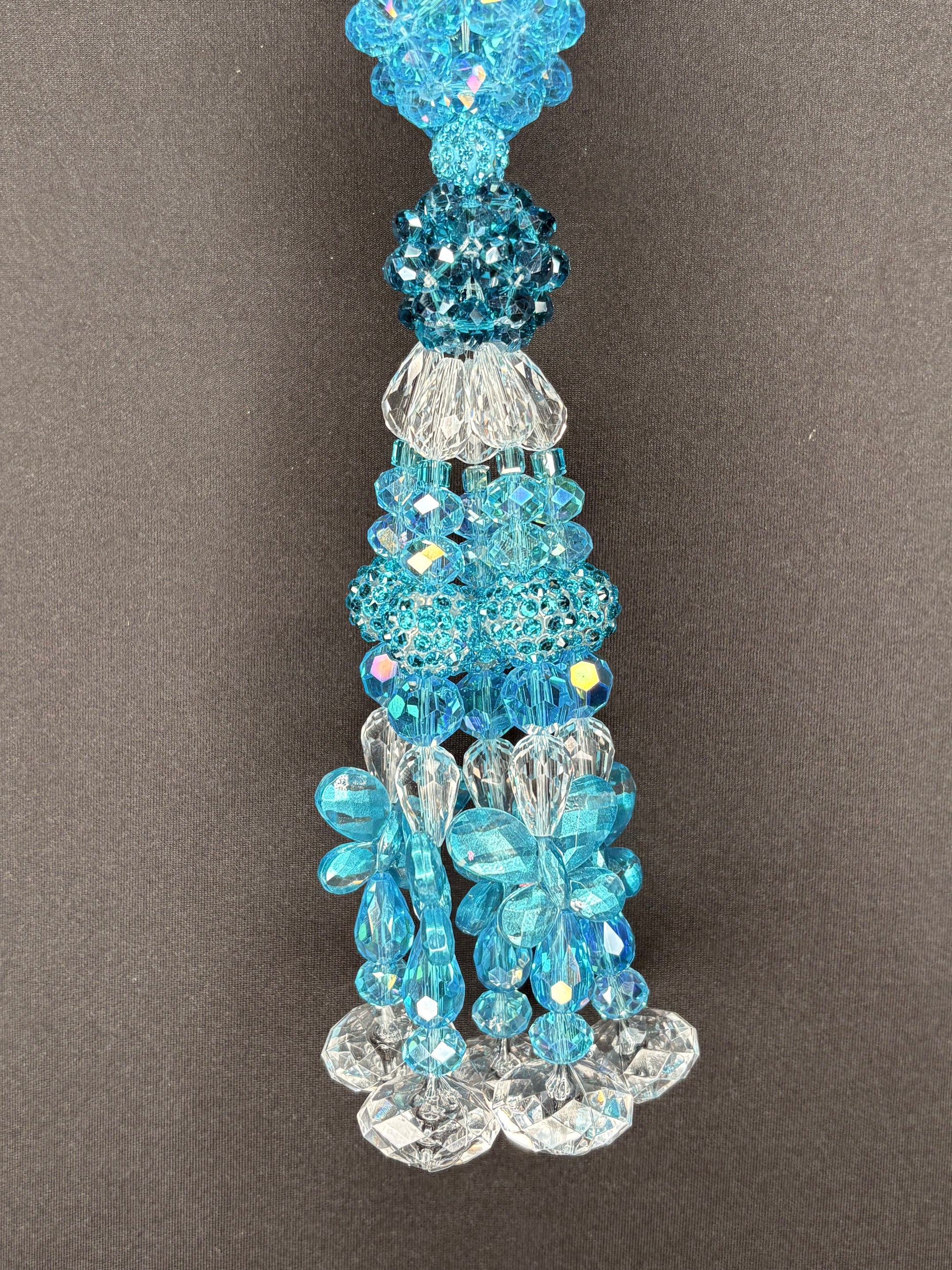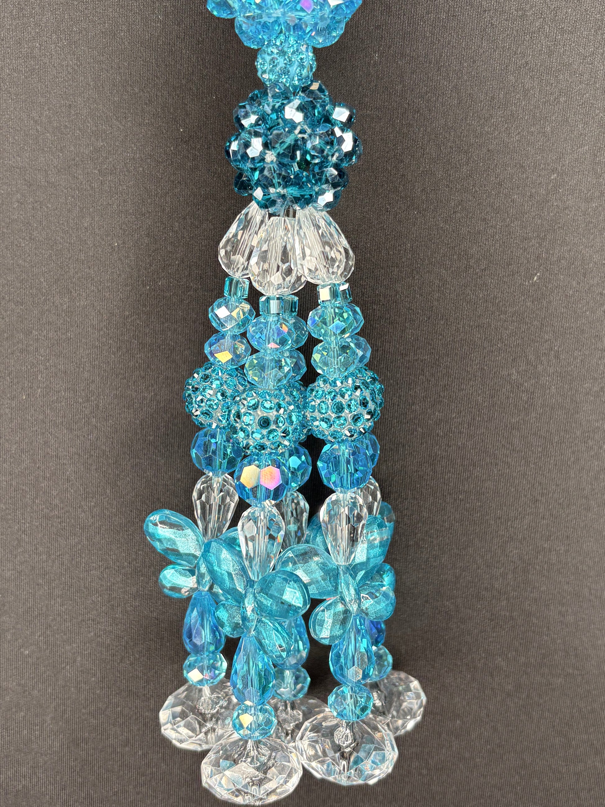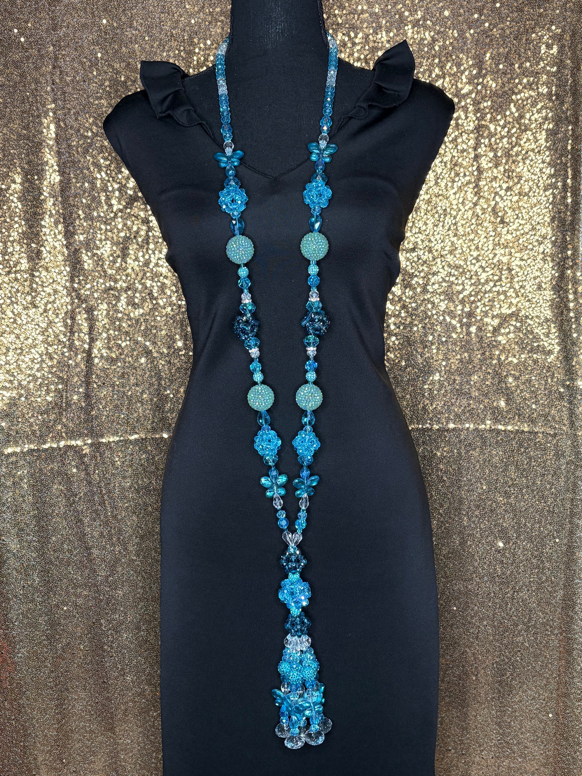 This handmade tassel necklace was carefully crafted with beautiful crystal (or rhinestone) beads. The model is wearing a 35-inch necklace design, but it can be altered to be longer or shorter.