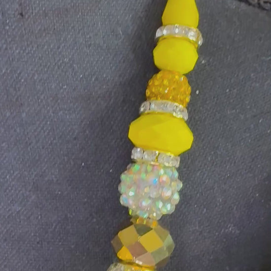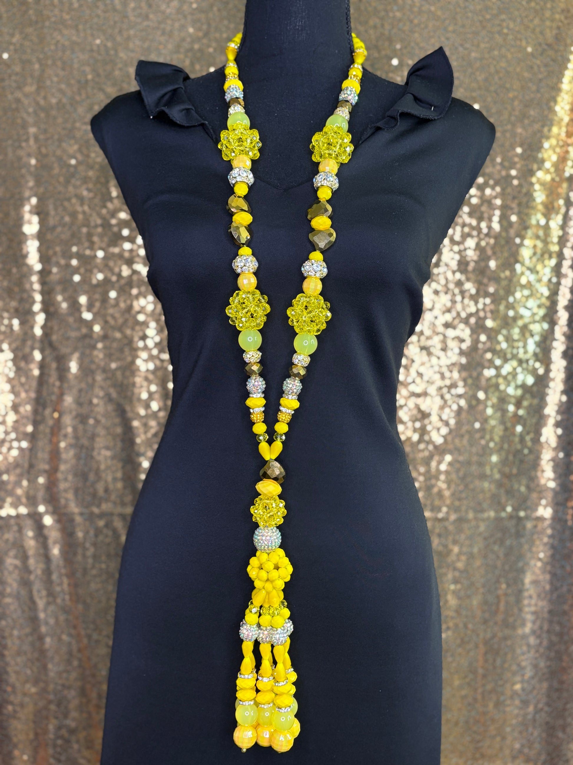 This handmade tassel necklace was carefully crafted with beautiful crystal (or rhinestone) beads. The model is wearing a 30-inch necklace design, but it can be altered to be longer or shorter.